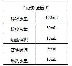 稱取試樣5g(精確至0.01g),置于400ml蒸餾管中。在SOA100上設置參數進行蒸餾,蒸餾完畢后,將接收液在T960滴定儀上進行滴定,同時做空白試驗。