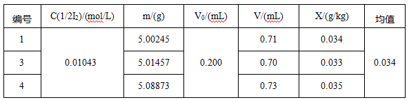 A--滴定試樣所用碘標準滴定溶液(0.01mol/L)的體積,單位為毫升(mL)