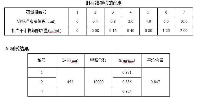 銅標準溶液(10ug/mL):取銅標準儲備溶液1ml于100ml容量瓶中,加水定容至刻度。