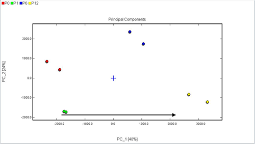 PCA 分析結果可知不同冷凍時間豬肉差異較大,隨著儲存時間的增加,樣品在圖中的位置右移。