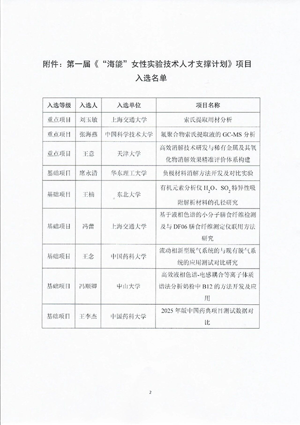 上海交通大學劉玉敏申報的“索氏提取用材分析”項目, 中國科學技術大學張海燕申報的“氟聚合物素氏提取液的GC-MS分析”項目,天津大學王意申報的“高效消解技術研發與稀有金屬及其氧化物消解效果精準評價體系構建”項目,獲得“海能”女性實驗技術人才支撐計劃重點項目。