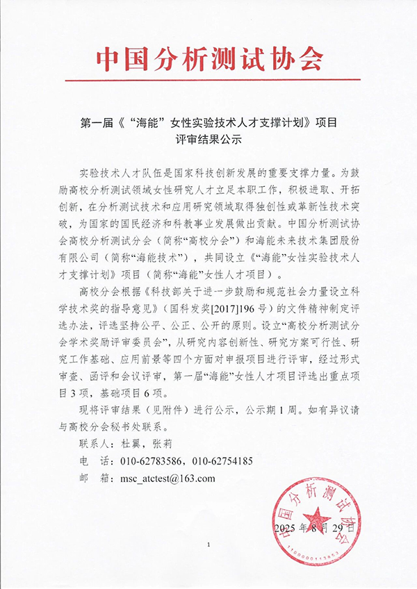 《“海能”女性實驗技術人才支撐計劃》項目(簡稱:“海能”女性人才項目)。由中國分析測試協會高校分析測試分會和海能技術共同設立,旨在鼓勵高校分析測試領域女性研究人才立足本職工作,積極進取、開拓創新,在分析測試技術和應用研究領域取得獨創性或革新性技術突破,為國家的國民經濟和科教事業發展做出貢獻。