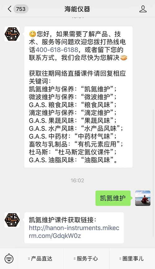 關注海能儀器公眾號,回復任意內容獲取直播關鍵詞清單,再回復相應關鍵詞即可獲取您想要的課件下載鏈接啦~是不是很簡單?