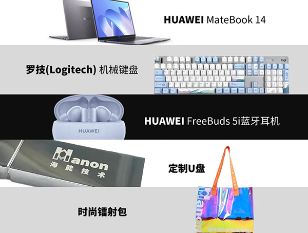 海能為大家現場準備了華為MATE BOOK 14、羅技機械鍵盤、華為藍牙耳機、定制U盤、時尚鐳射包等獎品,回饋用戶與參觀者的支持。