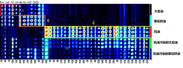 由上圖可知,大豆油和葵花籽油中存在部分共性的揮發性有機物,但在含量上存在顯著區分,如區域A、B所示,葵花籽油中物質的種類更為豐富。