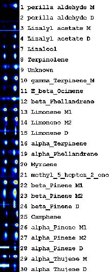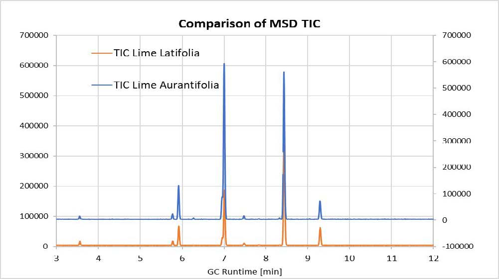 在其他氣味劑中,萜烯是一類化合物,它們在植物、花、提取物或精油中產生特定的香味,例如柑橘類精油或柑橘類餾分,廣泛應用于香水或飲料工業。對于訓練有素的專家來說,可以通過圖譜上的微小變化來確定重要的感官差異。但不同的萜烯比例很難用MS檢測器(結構相似度,靈敏度)進行表征,不同感官性質的精油其總離子流圖可能沒有顯示出分子組成差異;另一方面,
