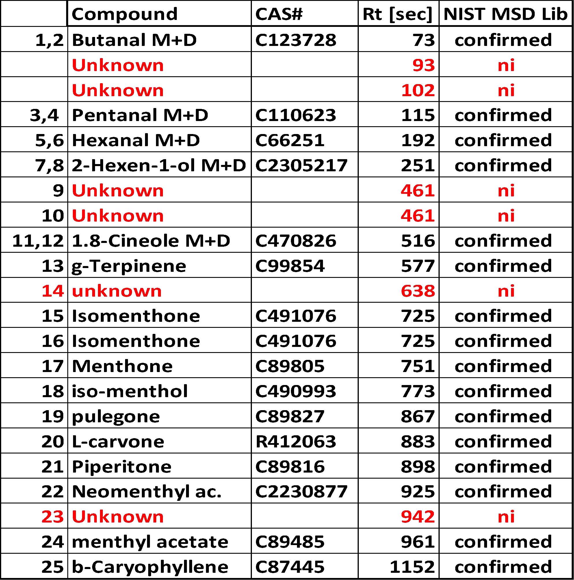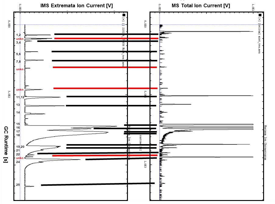 圖 5: MS-TIC 色譜圖與 GC-IMS 色譜圖進行比較。 標有紅線的信號表示在 NIST MS數據庫檢索無法識別的分子,而在VOCal 化合物數據庫中可以檢測(暫定識別)