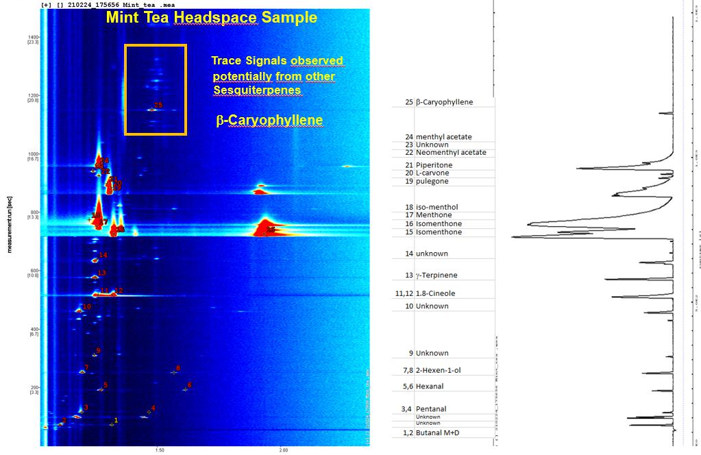靈敏度更為明顯,下圖為從一種商業薄荷茶的頂空中測得的GCxIMS色譜圖.