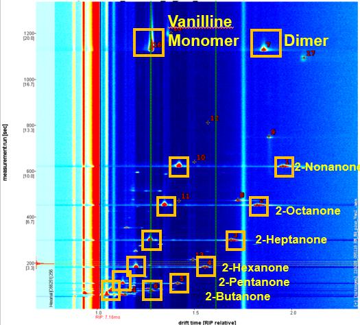 圖 3: 香蘭素是一種具有高強度的香味物質(RI ~1400弱極性柱),在GCxIMS色譜中可以檢測到信號峰