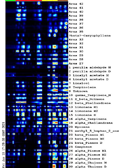 圖 9: Gallery-Plot指紋圖譜顯示柑桔3個亞科產品的單萜和倍半萜的強度(酸橙、檸檬和柑橘),每一種柑橘類產品都有自己的指紋
