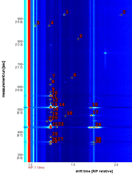 圖 8 左圖: 經GC - IMS色譜(放大圖)初步鑒定出30個峰。右圖: Gallery-Plot指紋圖譜,直接比較相關峰,只有少數分子具有類似的強度 ( 編號8,10,13-15 和 22-25)