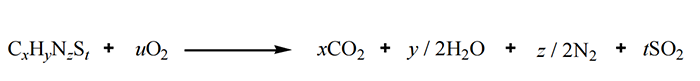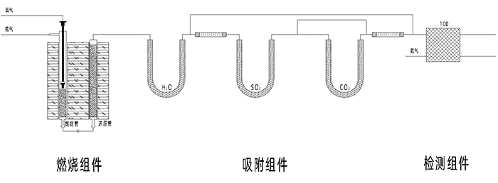 有機物中主要的元素為碳(C)、氫(H)、氮(N)、硫(S) 、氧(O)等。在高溫有氧條件下,有機物均可發生燃燒,燃燒后其中的有機元素分別轉化為相應穩定形態,如CO2、H2O、N2、SO2等。由載氣帶著燃燒產物氣體,經過吸附柱進行吸附-解吸的分離,并依次進入TCD熱導檢測器檢測各成分的含量。